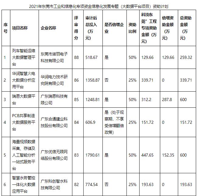 根据《东莞市工业和信息化专项资金管理办法》(东工信〔2021〕118号)《东莞市“倍增计划”专项资金管理办法》(东工信〔2021〕174号)《2021年“倍增计划”专项资金资助目录》(东倍增办〔2021〕128号)《关于组织申报2021年东莞市工业和信息化专项资金信息化发展专题(大数据平台项目)的通知》(东工信函〔2021〕175号)等文件要求,经过组织申报、项目审核、征求意见等流程,现将2021年东莞市工业和信息化专项资金信息化发展专题(大数据平台项目)资助计划予以公示。